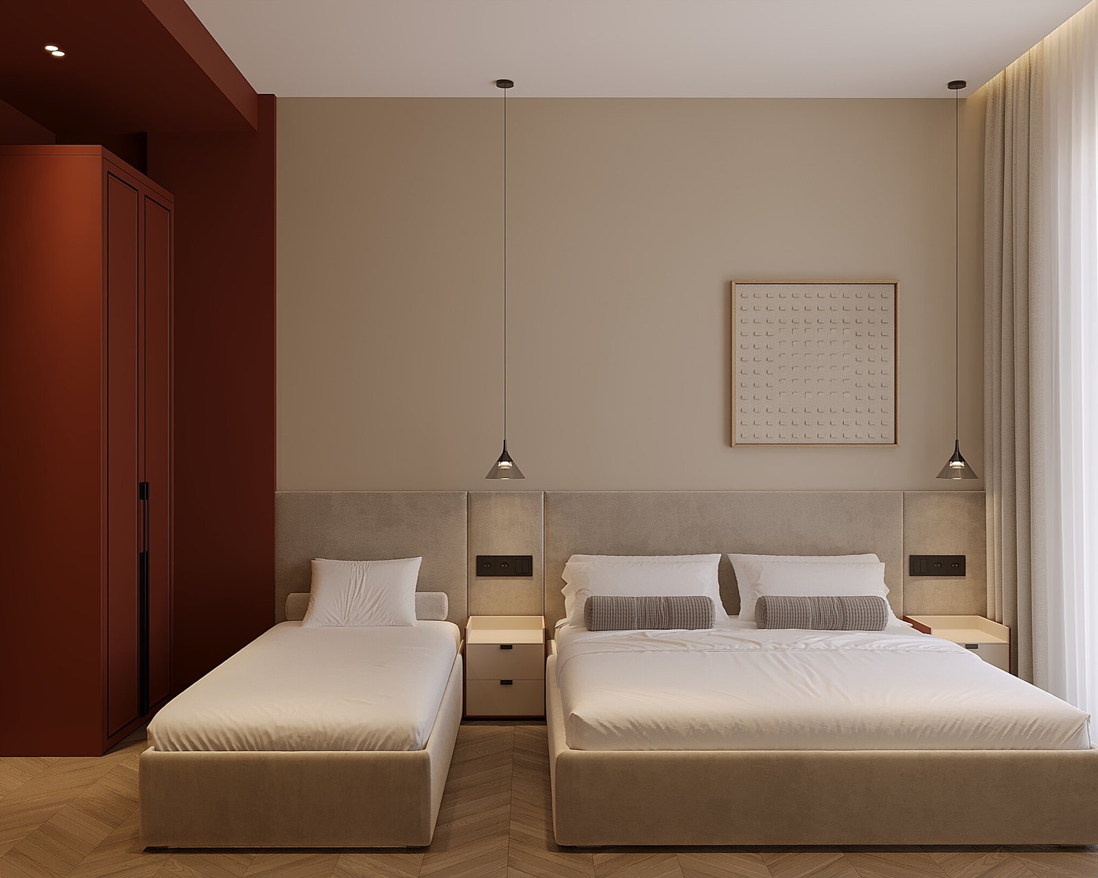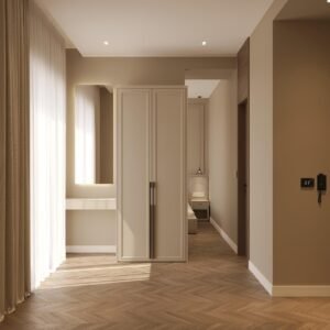 This project represents our studio’s vision for modern hospitality, where design becomes a bridge between luxury and comfort. The suites were conceived to provide guests with not only a place to rest, but also an immersive experience of calm and refinement. The design language is rooted in minimalist elegance, using a balanced palette of warm earthy tones, soft textures, and carefully curated lighting. Natural light plays a leading role, streaming through generous windows and creating a sense of openness and tranquility. Every detail — from the bespoke headboards to the concealed storage systems — is tailored to maximize both comfort and functionality without compromising aesthetics.A key aspect of the project was to design spaces that feel equally private and welcoming, where guests can unwind after travel yet still feel connected to their environment. The result is a series of suites that merge contemporary sophistication with a timeless sense of serenity, ensuring each visitor leaves with a memorable and restorative experience.