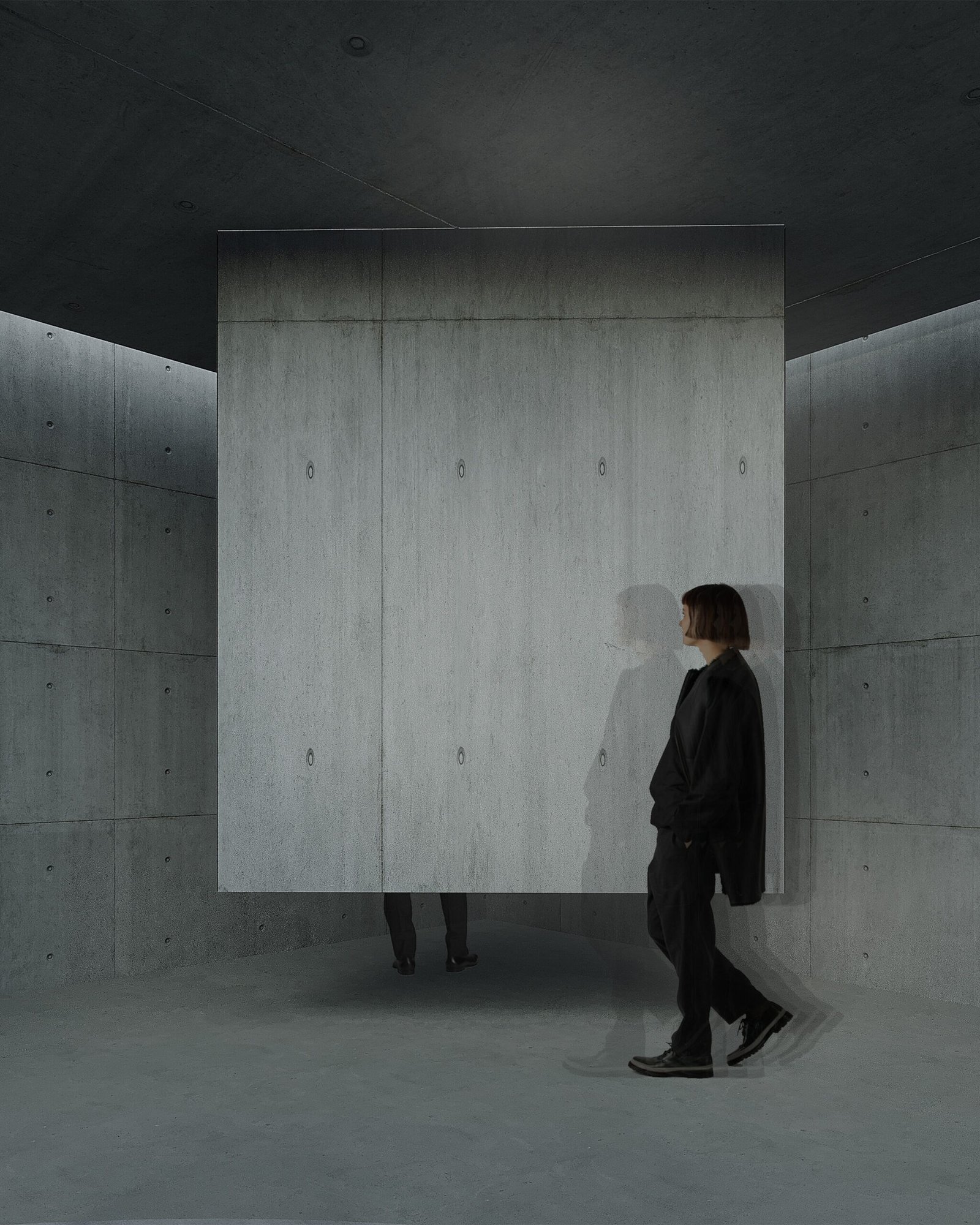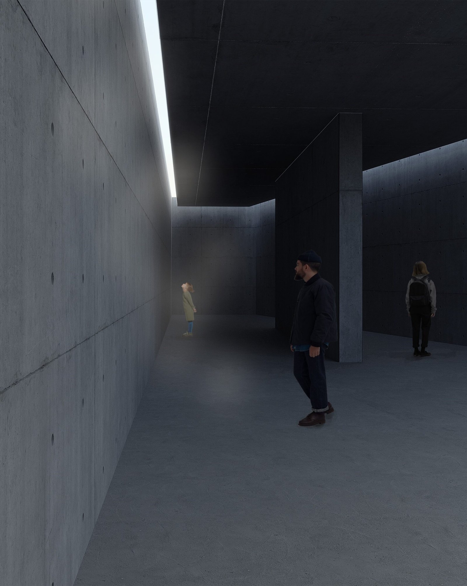 The design concept is rooted in geometry and symbolism. Visitors pass through these thresholds as though crossing emotional states, moving from one spatial experience to another. The play of light and shadow, along with the raw materiality of exposed concrete, creates an atmosphere that is both contemplative and powerful.