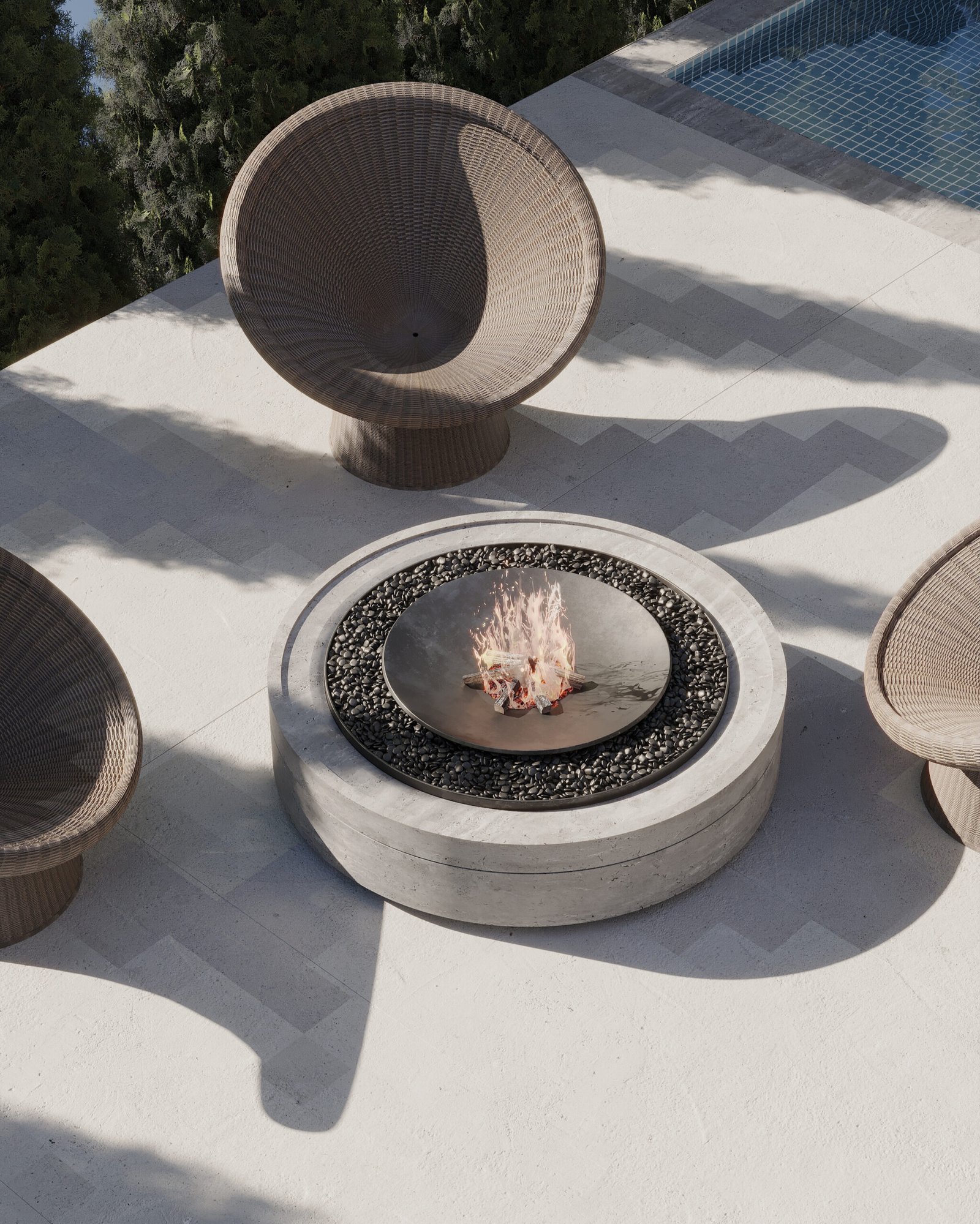 Outdoor areas extend the villa’s philosophy of understated luxury. A sculptural firepit lounge invites relaxation and social gatherings, connecting the interior with the surrounding environment. The interplay between solid, tactile materials and open, airy layouts establishes a continuous dialogue between protection and openness, intimacy and connection.