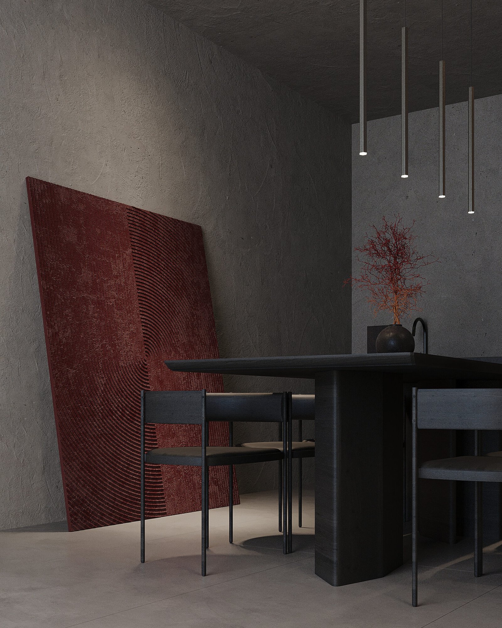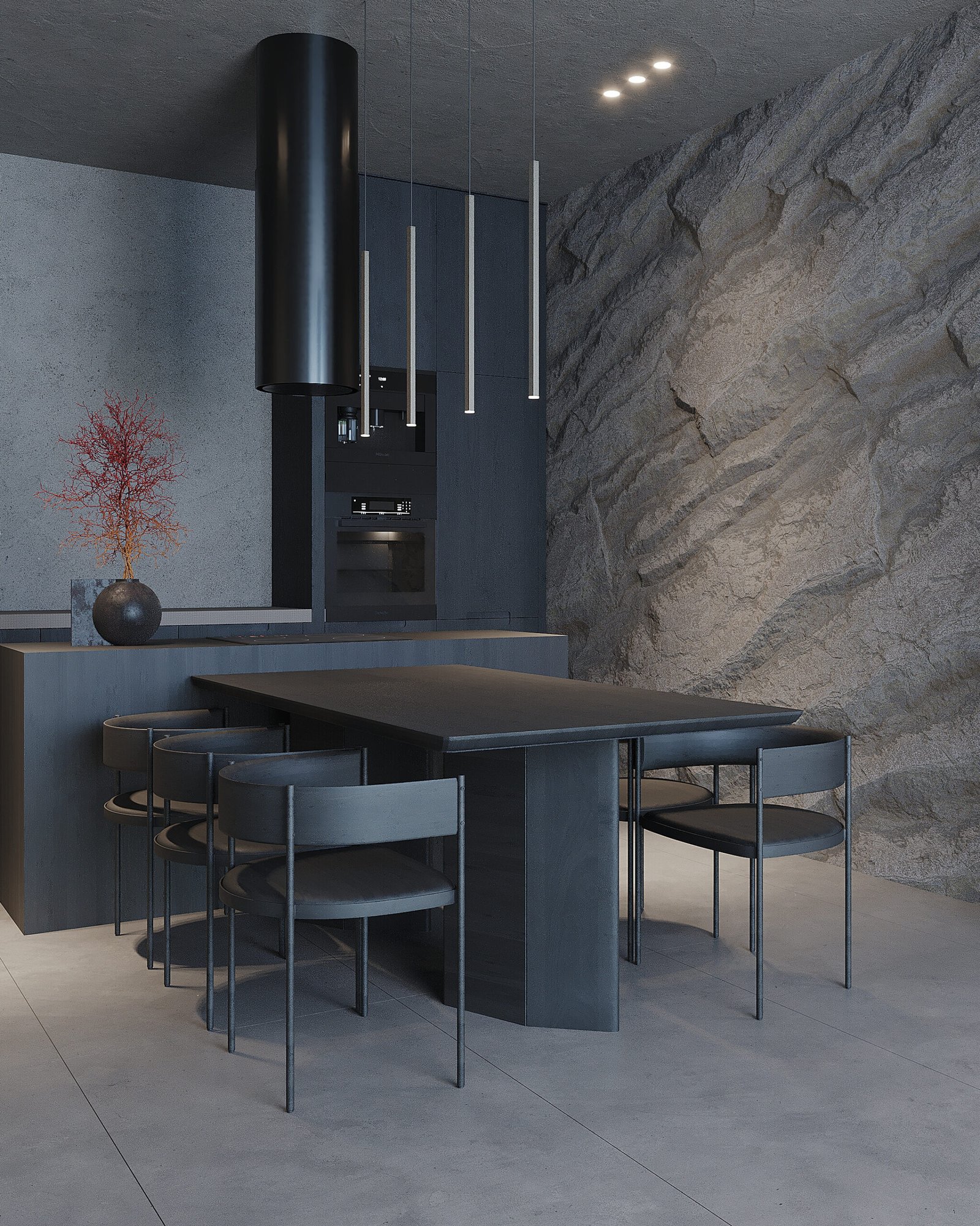 The interior relies heavily on contrasts: dark tones and clean lines are softened by the richness of natural stone walls and the warmth of carefully selected accent elements. Every element is crafted to be both functional and visually striking, turning everyday living into a refined experience.